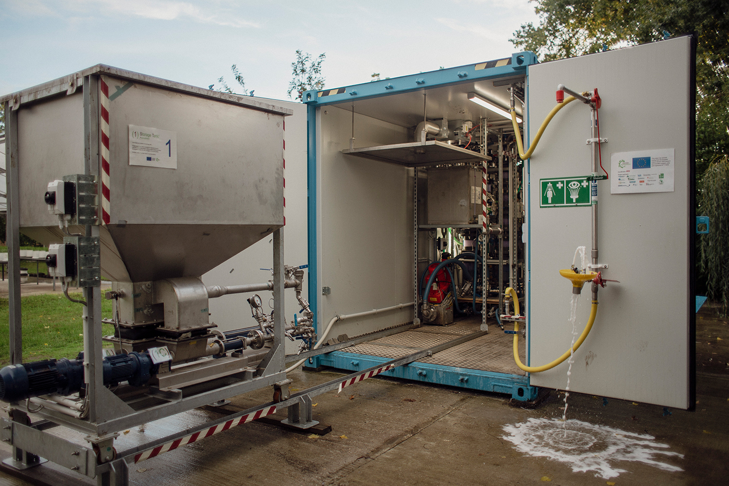 Vor dem blauen Container auf der Versuchsstation des IASP Berlin | Institut für Agrar- und Stadtökologische Projekte im malerischen Berge bei Nauen freut sich Johannes auf alle Interessierten. Kommen Sie vorbei, erfahren Sie mehr über die Schließung von Nährstoffkreisläufen in der europäischen Landwirtschaft und schauen Sie sich unsere spannende Pilotanlage aus nächster Nähe an!